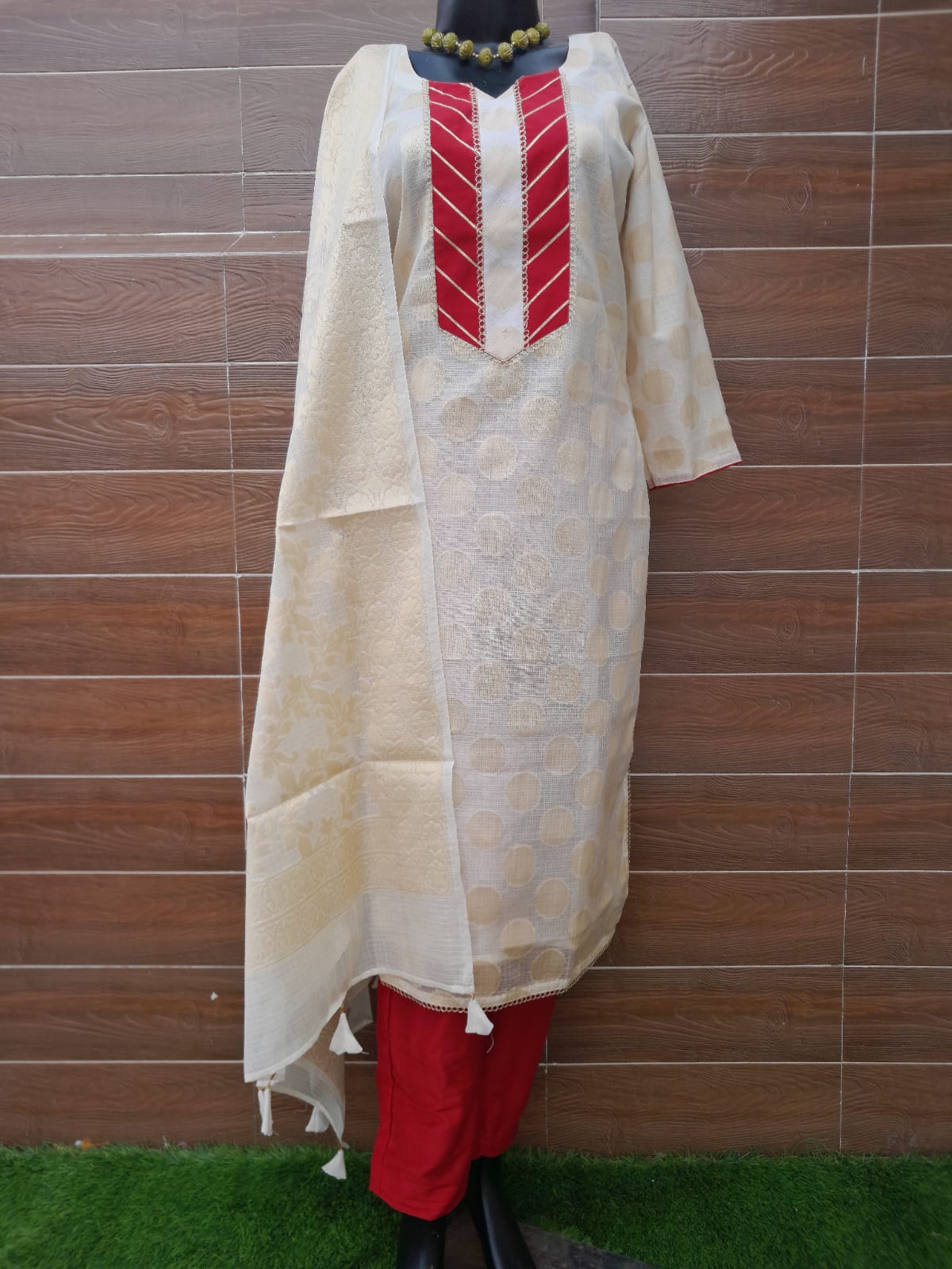 - Kurta -Soft Kota Zari weaving pearl white color straight kurta with cotton lining heavy panel with weaving border on sleeves