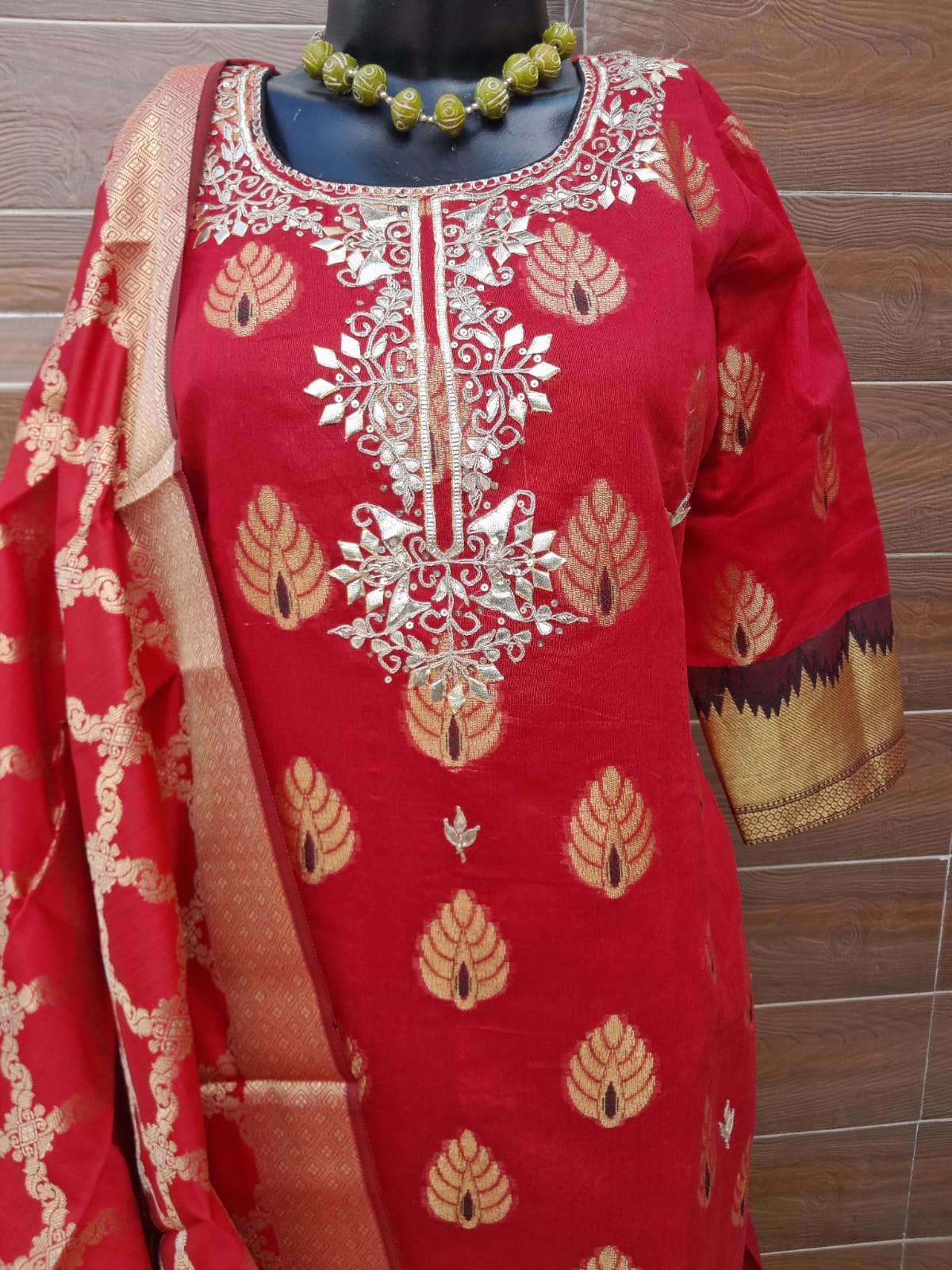• Kurta -Banarsi silk gotta patti hand work  Red color  straight kurta with cotton lining matching border on neck and sleeves